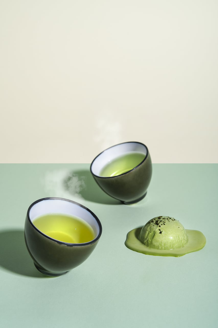 湯呑みは、内側の白が茶葉本来の色合いを引き立て、外側には「織部」をイメージした深みのある緑を施しました。